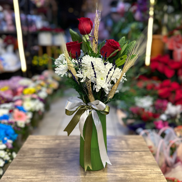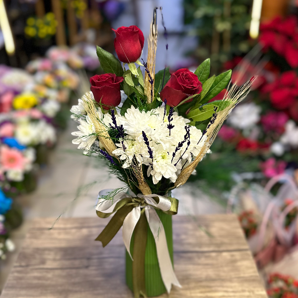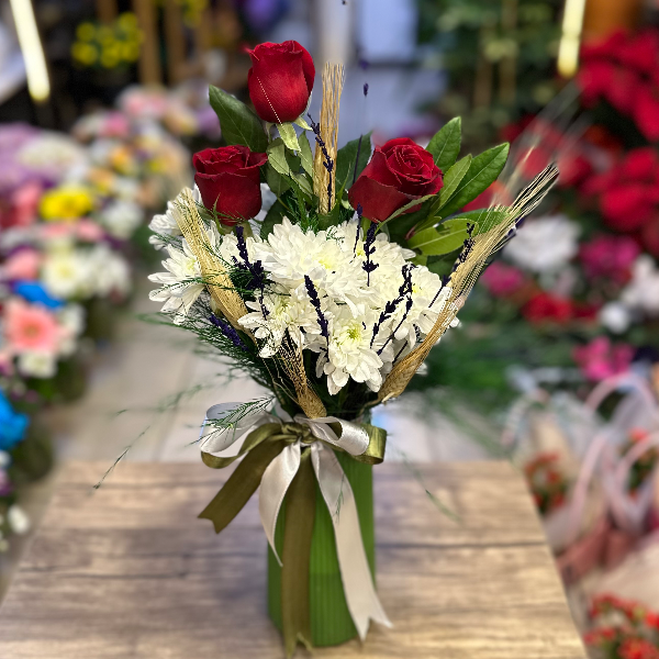 Ürün Kodu: DC345Yeşil vazo içinde 3 kırmızı gül, beyaz krizantem, lavanta ve başak ile hazırlanan zarif bir tasarım. Modern görünümüyle özel günlerde şık bir hediye