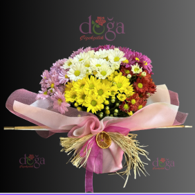 Ürün Kodu: DC123Beyaz Taze Krizantem Çiçeklerinin Kahverengi Fon Kağıdı ile Sunumu