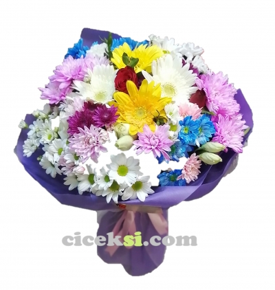 Ürün Kodu: DC122Karışık Krizantem Çiçekleri ve 1 Adet Kırmızı Gül Demeti